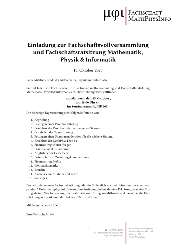 Die Fachschaft MathPhysInfo lädt im Semester jede Woche am Mittwoch um 18:15 Uhr zur Gemeinsamen Fachschaftssitzung ein. Diese findet normalerweise im Mathematikon (INF 205) im Seminarraum A statt.